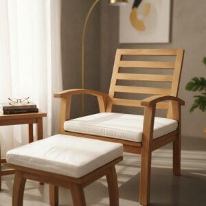 Silla de teca con reposapiés y cojines impermeables. Elegante, cómoda y duradera, ideal para terrazas, balcones o áreas de descanso.