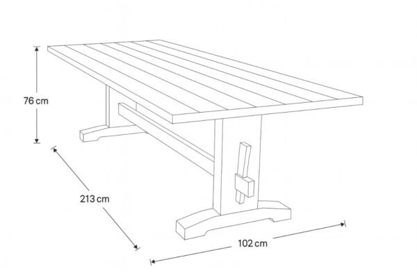 Fabricada en madera maciza de teca, reconocida por su resistencia y belleza natural, esta mesa de 213 x 102 cm permite acomodar cómodamente de 6 a 8 personas, brindando suficiente espacio entre cada comensal.