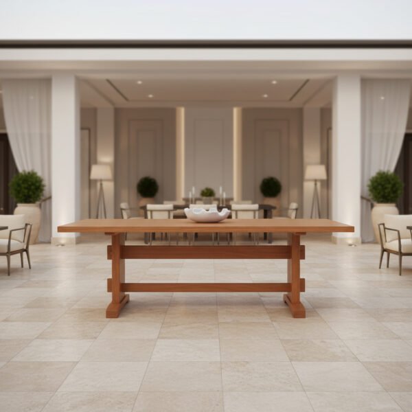 Mesa de comedor rectangular en teca, 213×102 cm. Amplia y elegante, ideal para 6 a 8 personas. Perfecta para interiores o terrazas techadas.