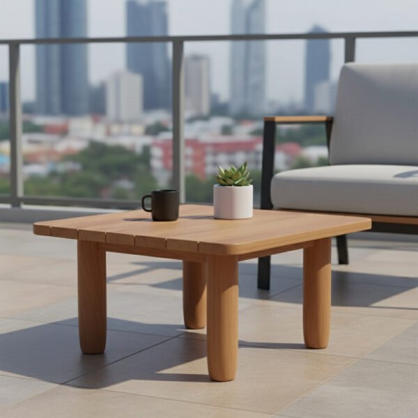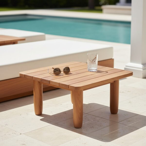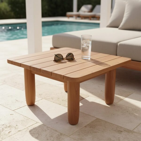 Mesa cuadrada de teca en tablones. Ideal como mesa auxiliar para bebidas o decoración, resistente y elegante para interior o exterior.