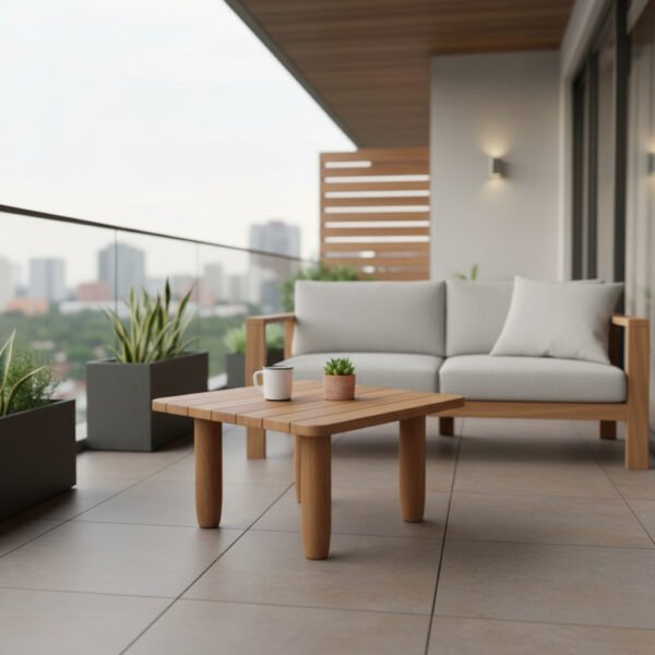 Fabricada en madera maciza de teca, ofrece resistencia, estabilidad y belleza natural, manteniendo su acabado elegante incluso en ambientes exteriores.