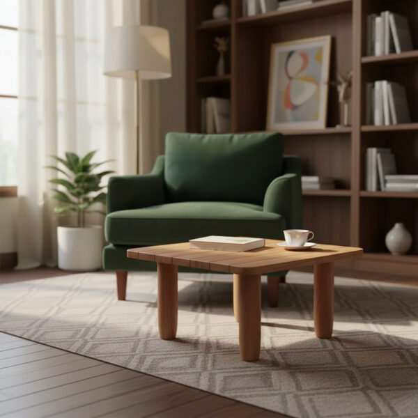 Su diseño cuadrado y compacto la hace ideal para colocar bebidas, libros o elementos decorativos, aportando calidez y estilo atemporal a cualquier espacio.