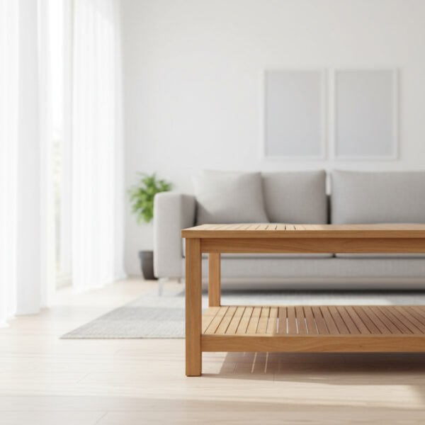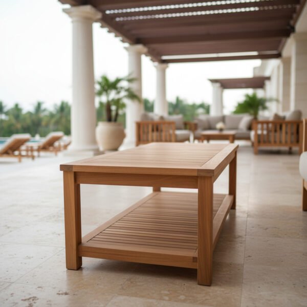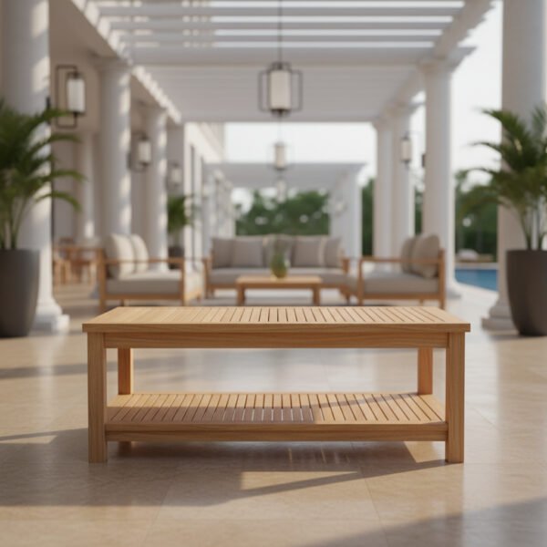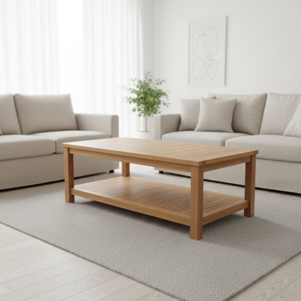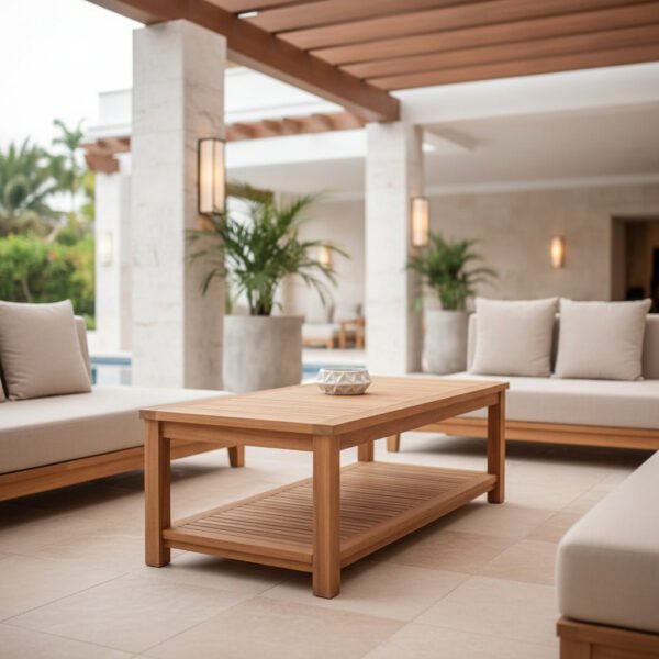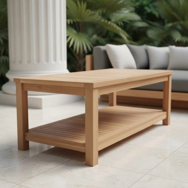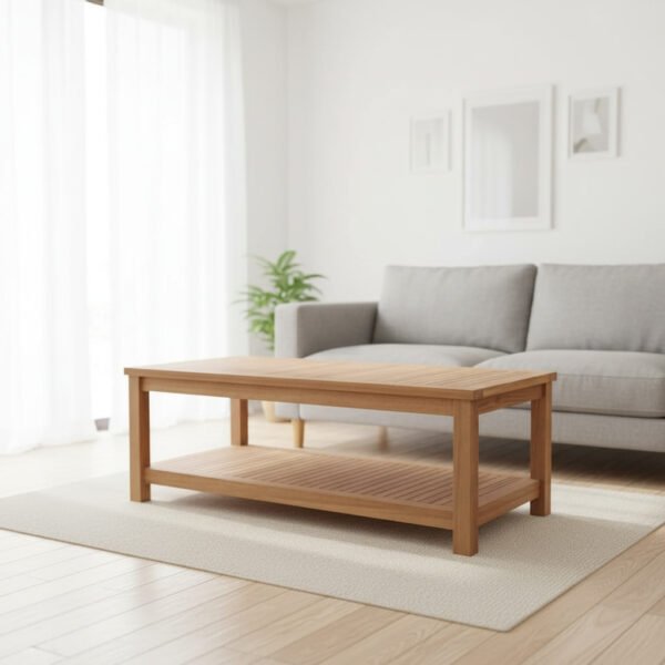 Mesa de centro rectangular en teca, 120x80x45 cm. Compacta, moderna y resistente, ideal para salas o terrazas contemporáneas.