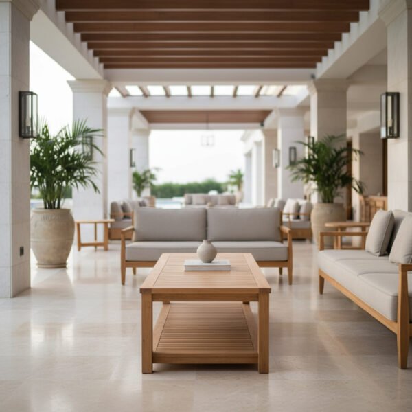 Los tablones de teca realzan la textura y los tonos naturales de la madera, combinando estilo contemporáneo y durabilidad artesanal.