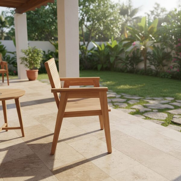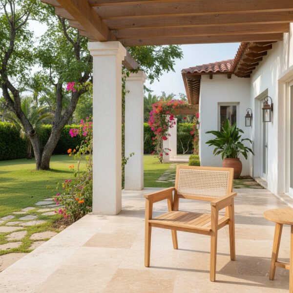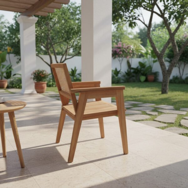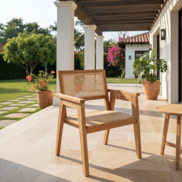 La Silla con Respaldo Tejido combina madera maciza de teca y fibras naturales, creando una pieza que une artesanía, confort y estilo contemporáneo.