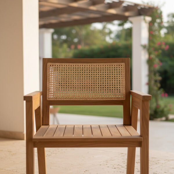 Silla de teca con respaldo tejido natural. Elegante, fresca y cómoda, ideal para comedores, terrazas o interiores modernos.